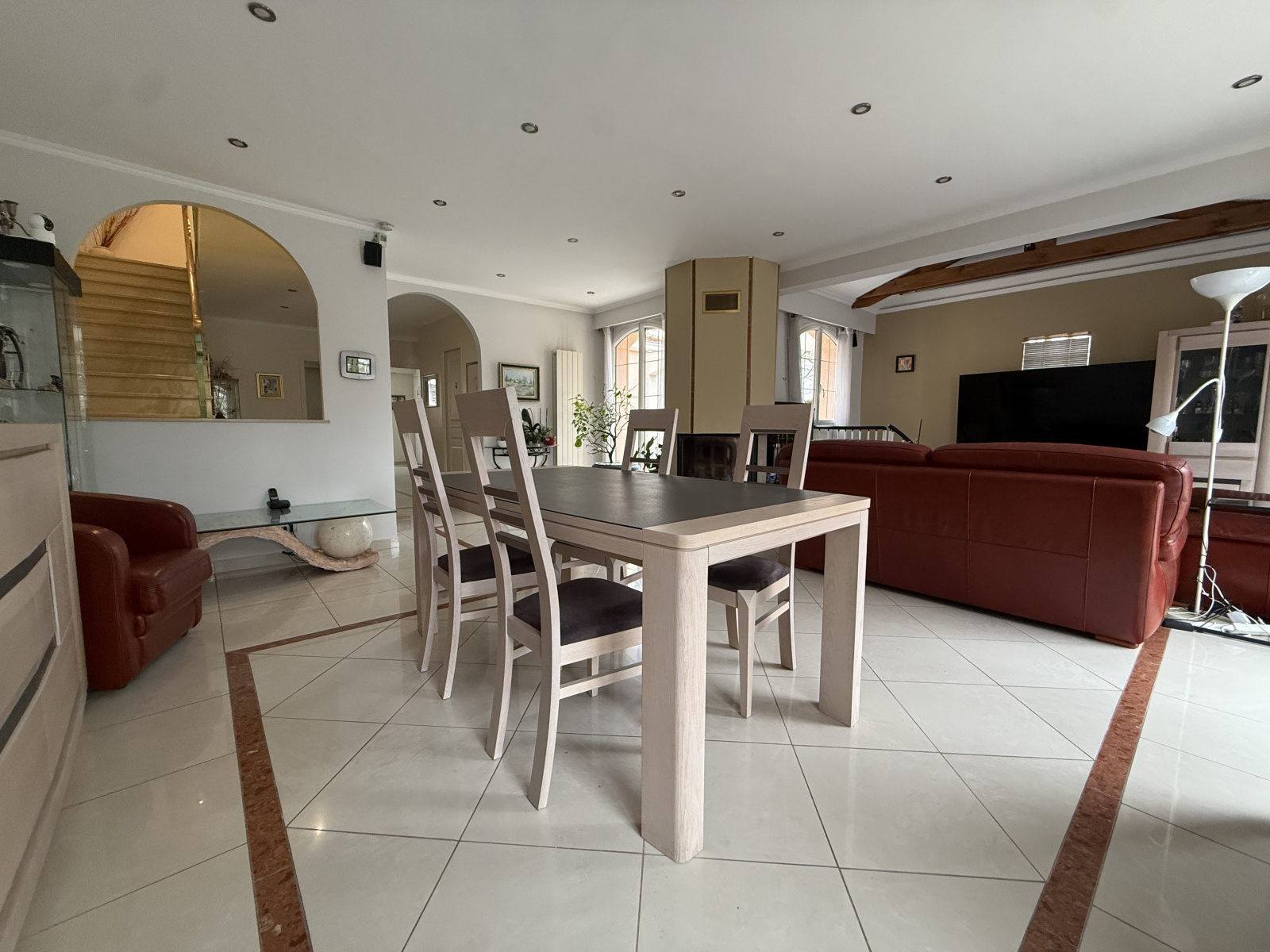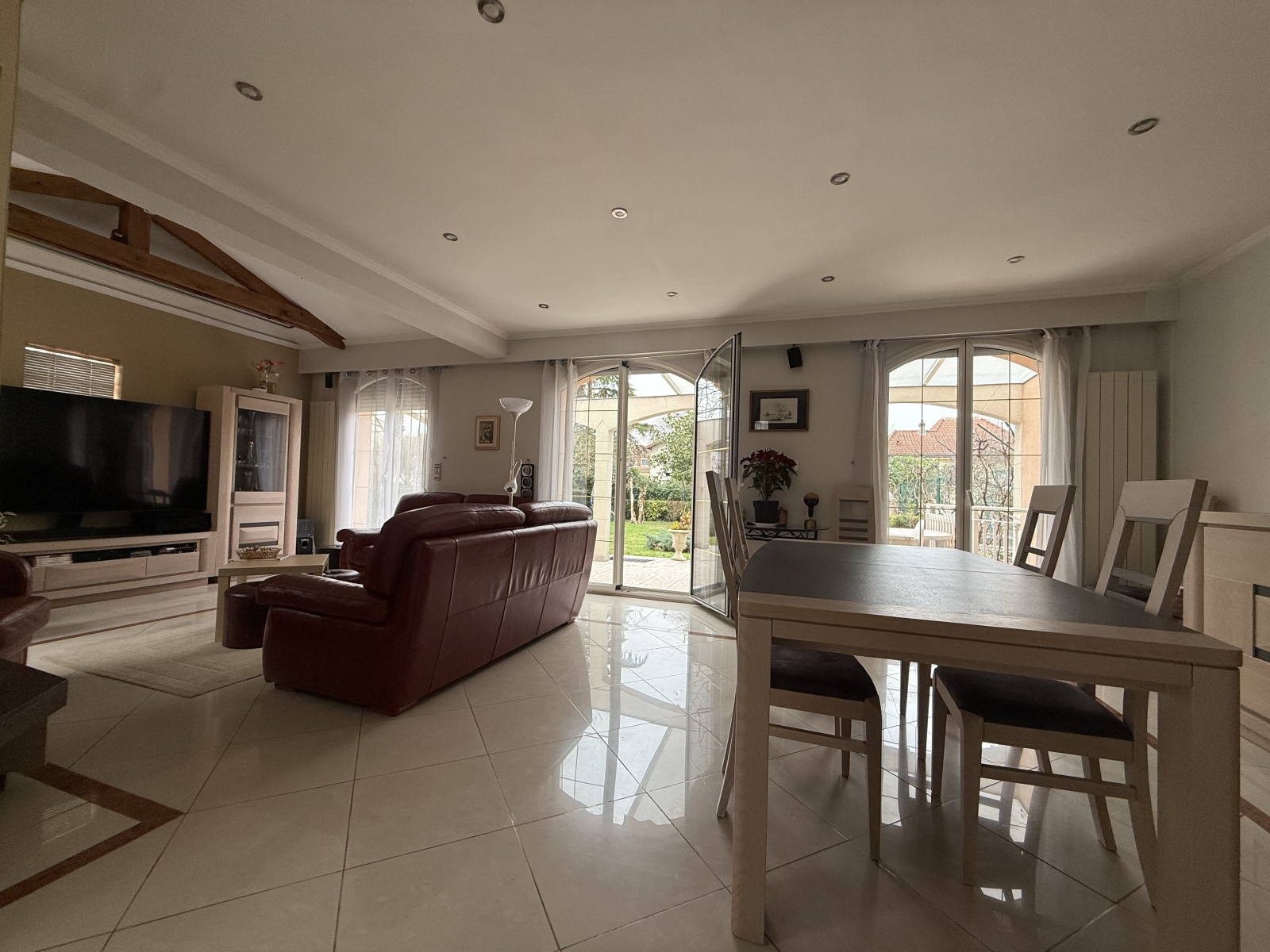 Il se compose d’un sous-sol total comprenant un garage, une buanderie, une chaufferie et une salle de jeux. Le rez-de-chaussée accueille une entrée, un séjour lumineux avec cheminée, une cuisine avec accès direct au jardin, un bureau et un WC avec point d’eau. À l’étage, un palier dessert trois chambres, une salle de bains avec WC ainsi que des combles aménagés, offrant de beaux volumes et de multiples possibilités.
