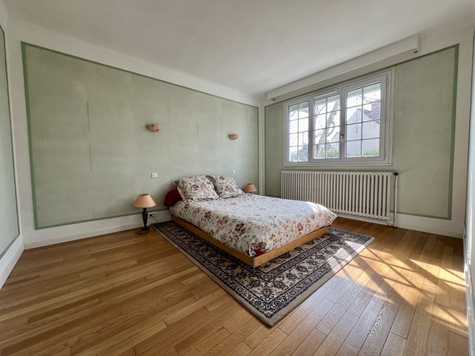 Au rez-de-chaussée surélevé : un somptueux hall d'entrée distribue avec élégance les différentes pièces : une agréable pièce de vie baignée de lumière (avec cheminée fonctionnelle) et prolongée d'une terrasse, une cuisine dinatoire avec accès sur balcon..., deux grandes chambres non mansardées, une salle de bains et WC indépendant.
