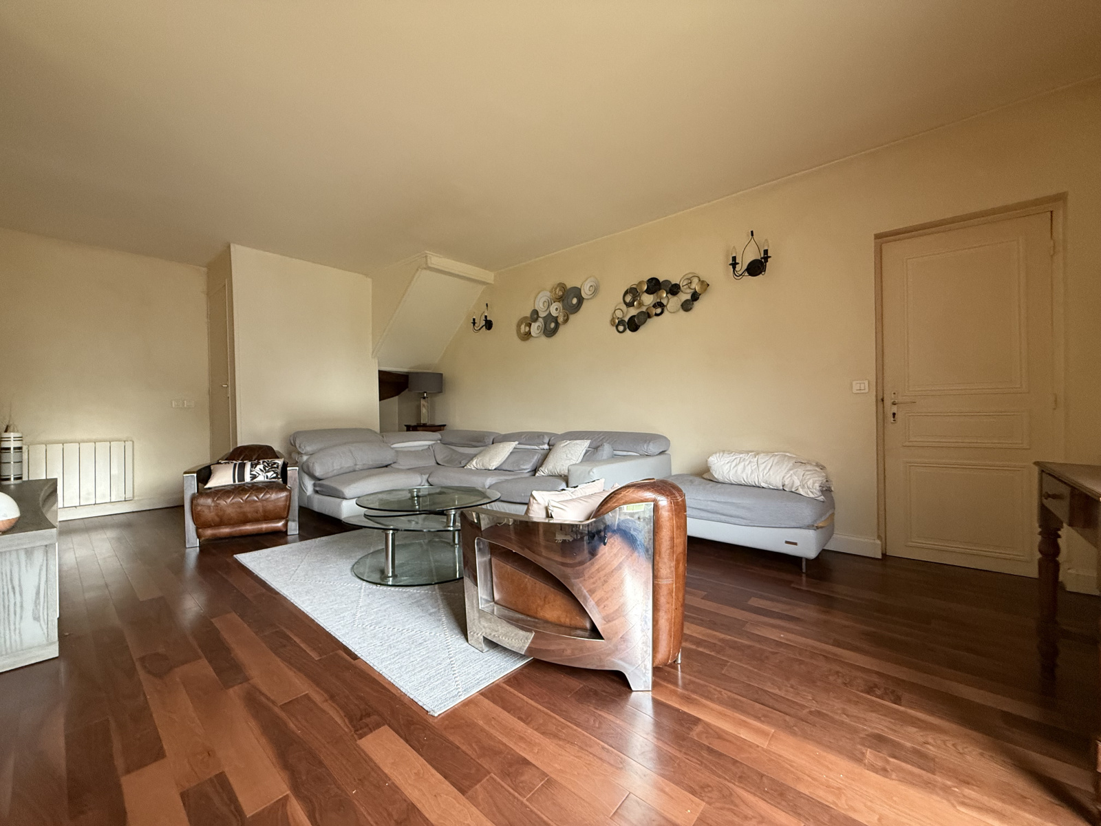 Un hall d’entrée mène à un double séjour de 40 m² et à une cuisine équipée ouvrant sur une terrasse. Le rez-de-chaussée comprend aussi une suite parentale, une salle d’eau avec WC.