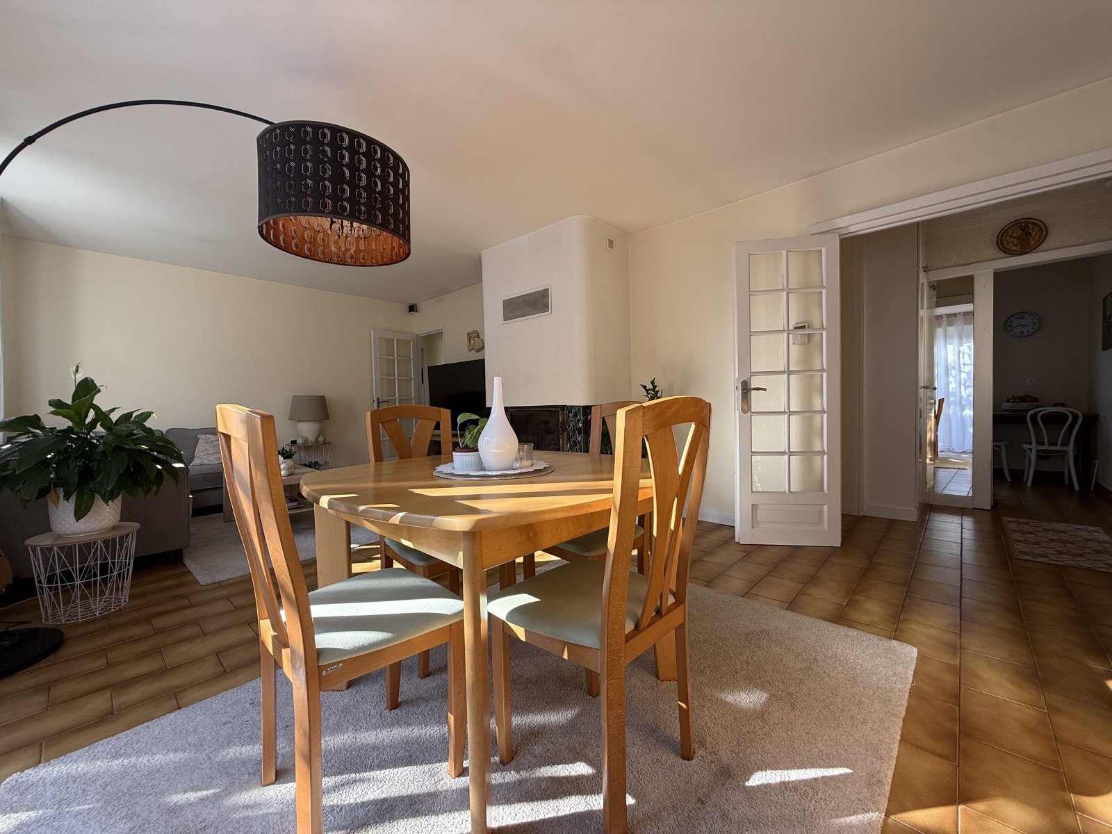 L’espace de vie comprend une entrée fonctionnelle avec placard, une cuisine aménagée et équipée donnant directement sur le jardin, ainsi qu’un vaste séjour-salon d’environ 30 m², baigné de lumière naturelle, agrémenté d’une cheminée créant une atmosphère chaleureuse et conviviale.